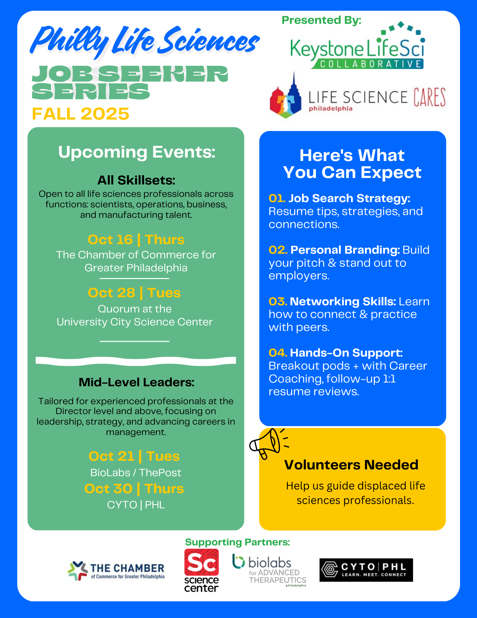 Free, hands-on workshops for life sciences professionals navigating a career transition in Philadelphia. Presented by Life Science Cares Philadelphia and Keystone LifeSci Collaborative.